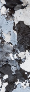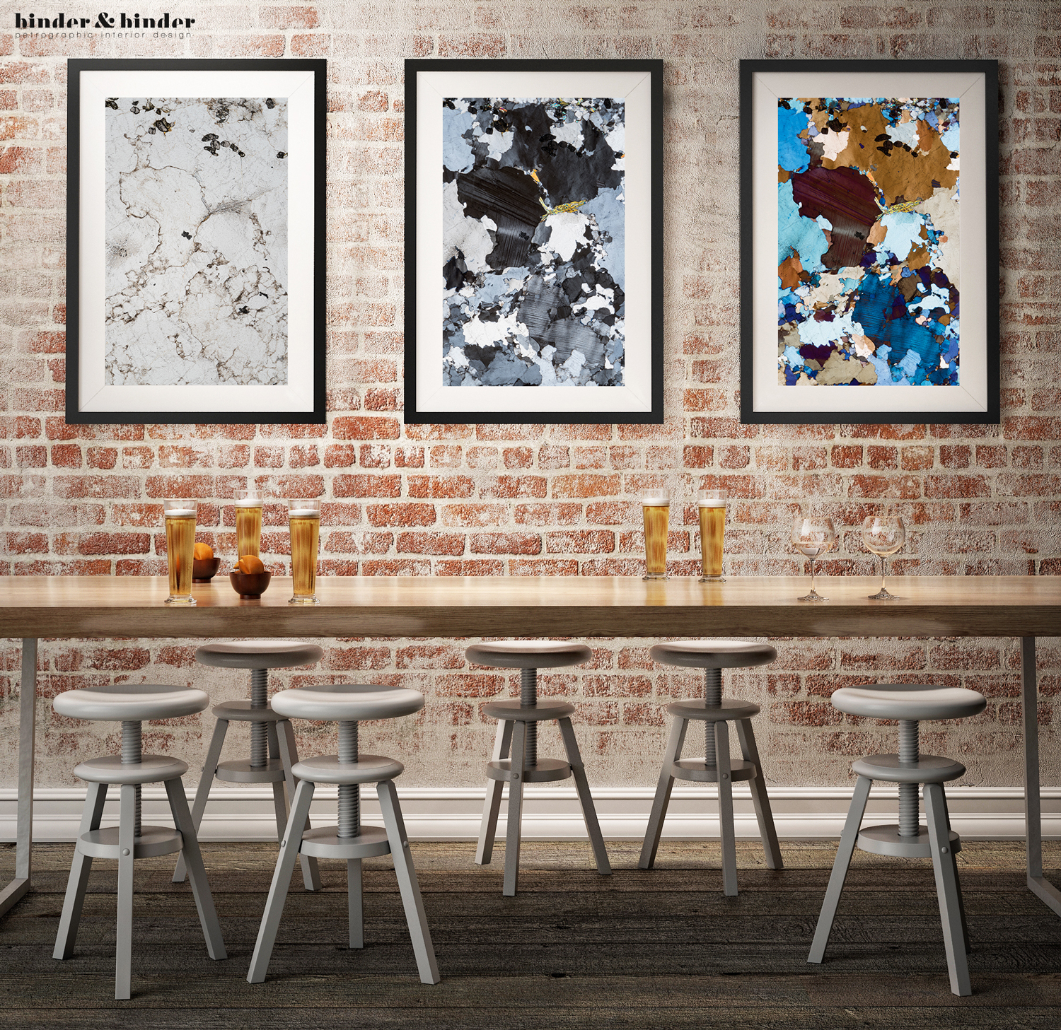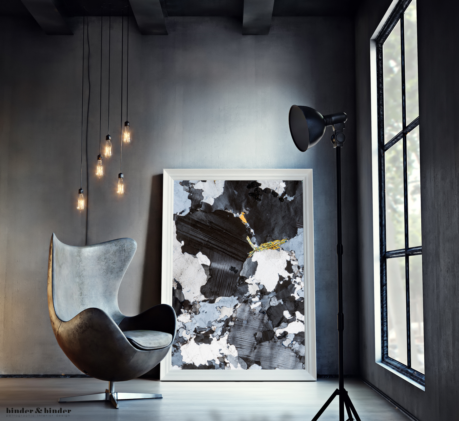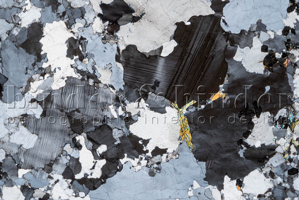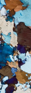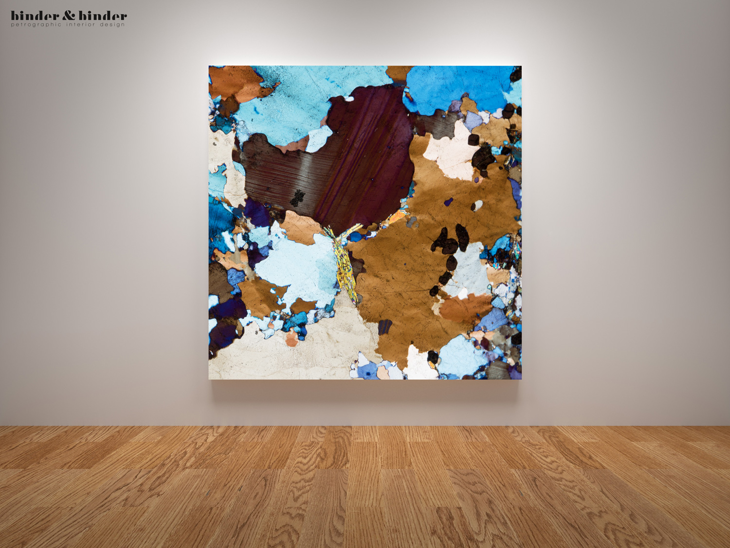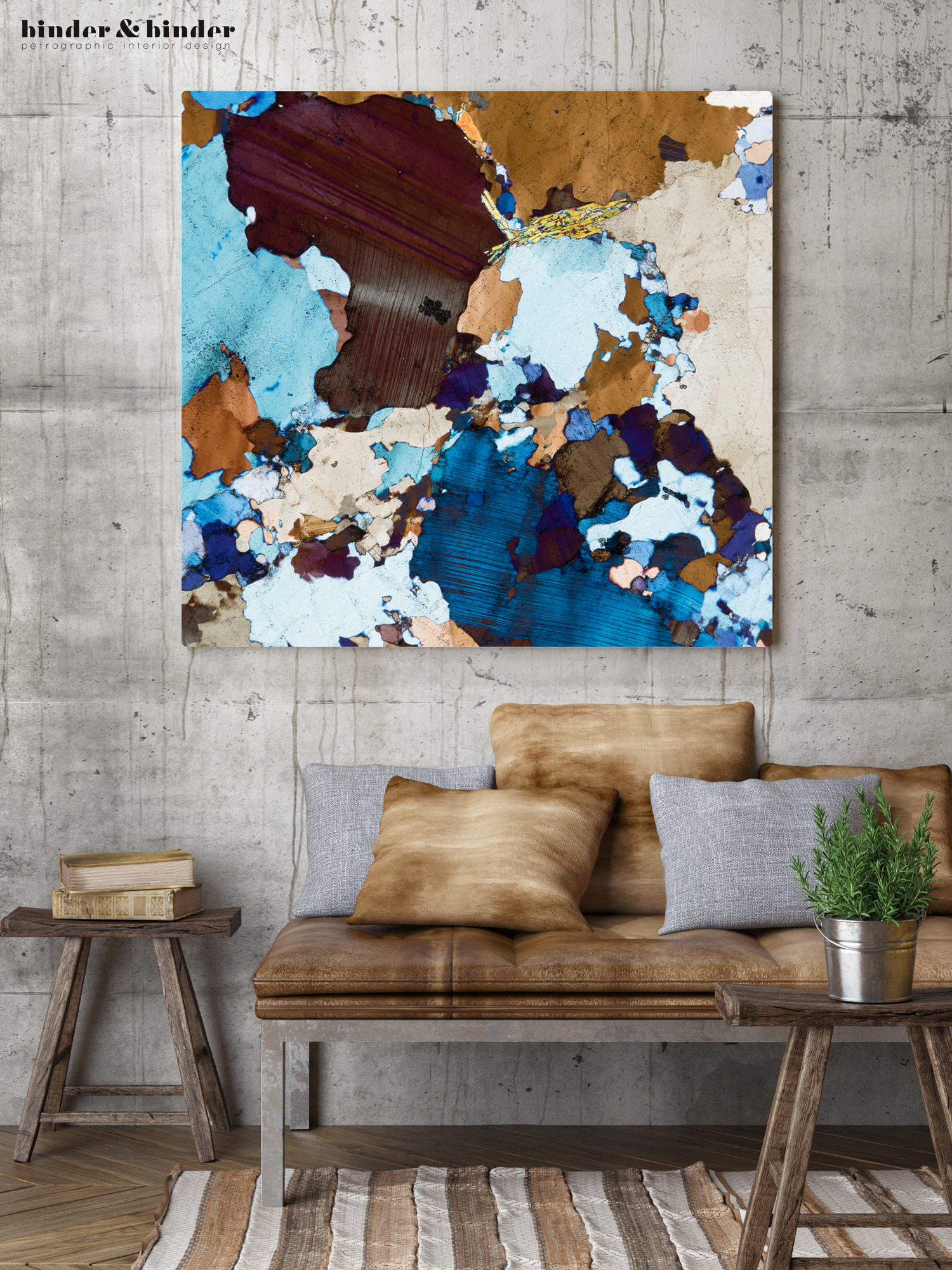 Das faszinierende Innenleben eines Alpengesteins. Fein abgestuftes Blau des Himmels und des Wassers, Brauntöne der Erde und des Sandes, das Rot-violett der Beerenfrüchte bilden ein farblich wohl abgestimmtes Ensemble. Um die Aufmerksamkeit des Betrachters konkurrieren verzahnte ineinandergreifende Strukturen mit feinst-lamellierten fließenden Texturen. Eine Ruhe ausstrahlende Natur-Choreografie aus 2200m Höhe.